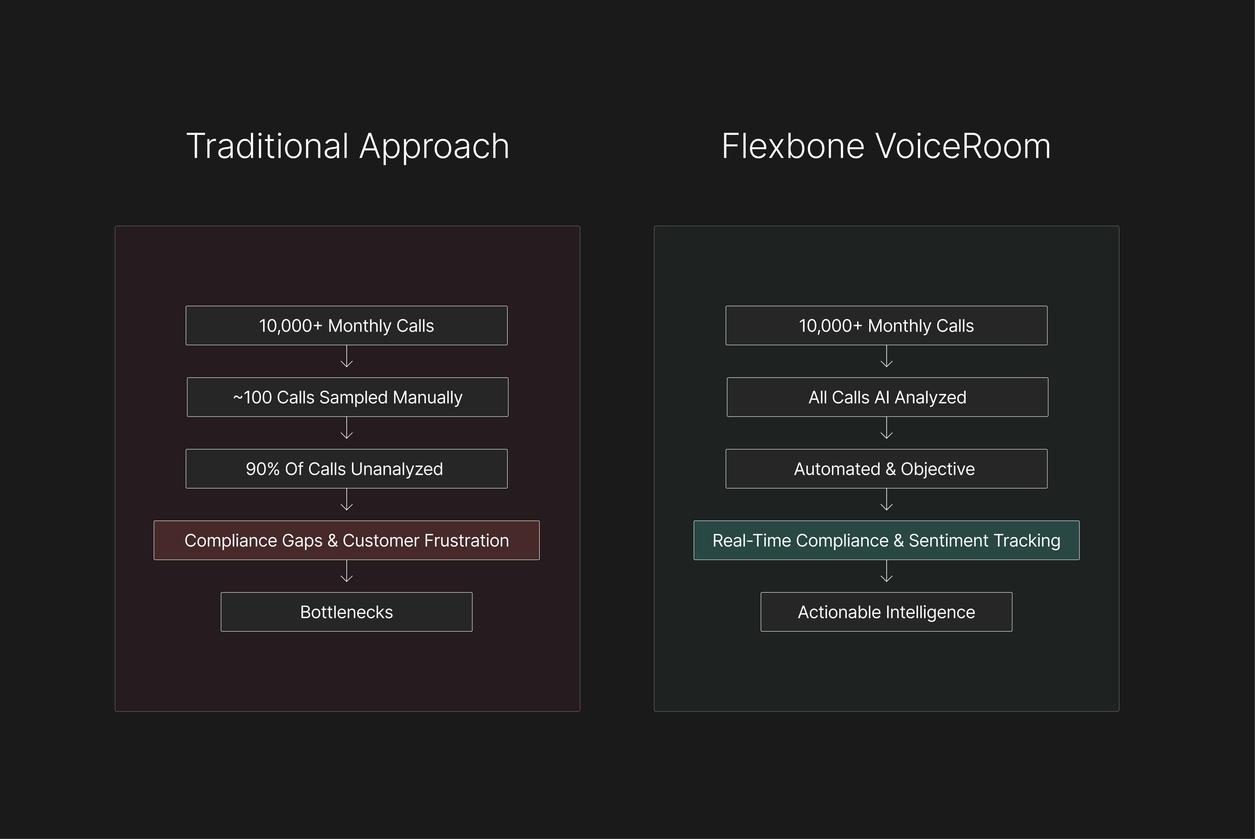 Flexbone’s Voice Room changes that. It connects directly to your VoIP or telephony system and transforms unstructured audio into structured, searchable intelligence so you can finally understand what is happening across every call, every day.